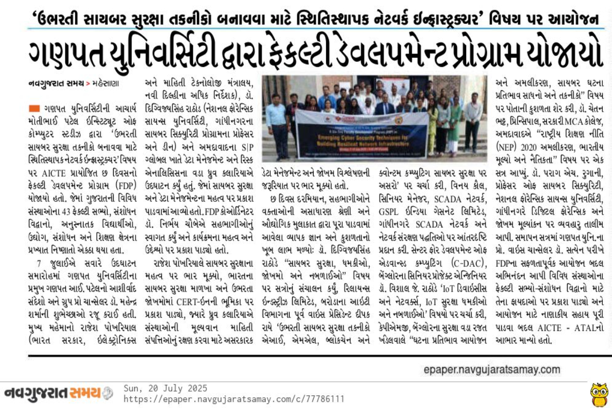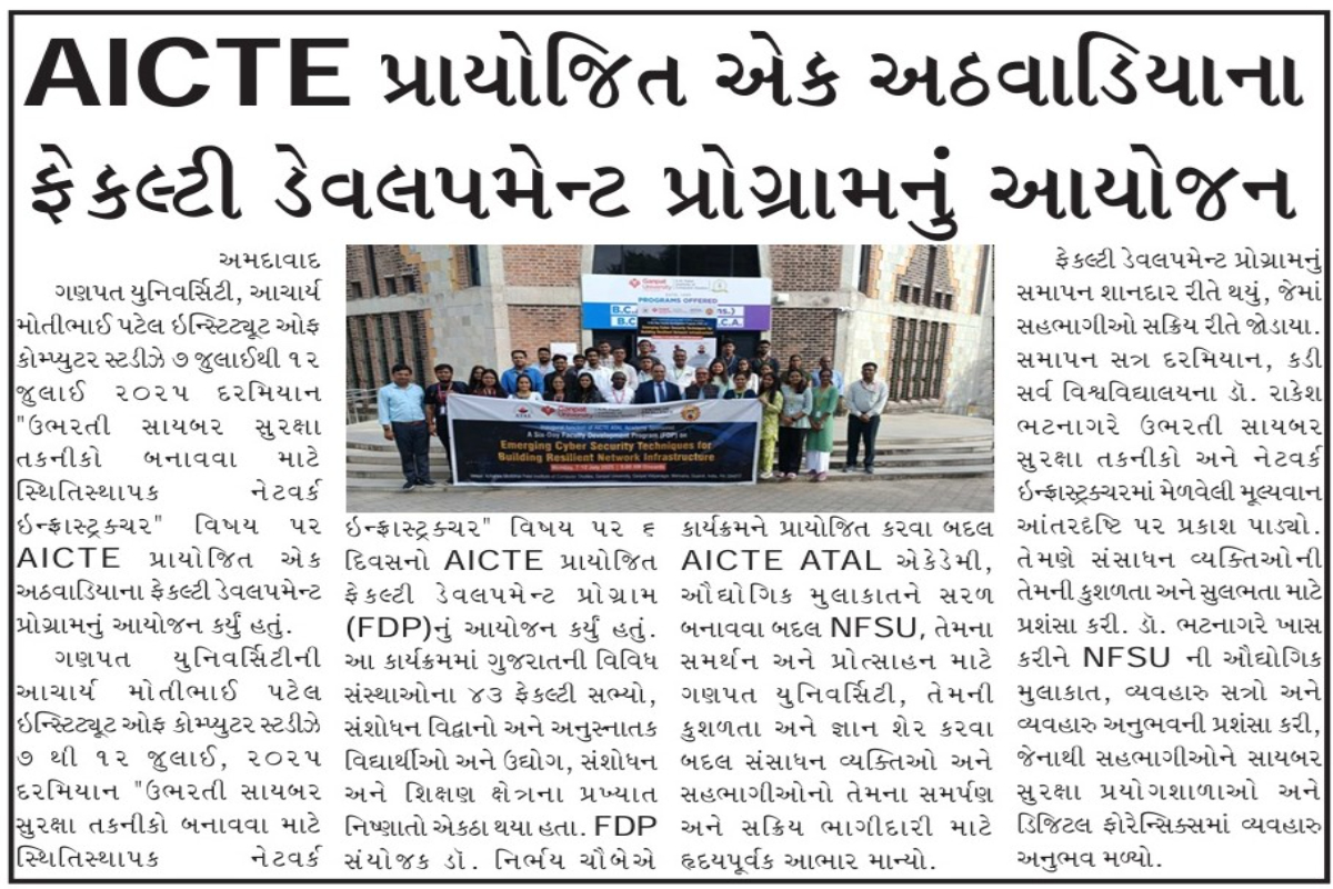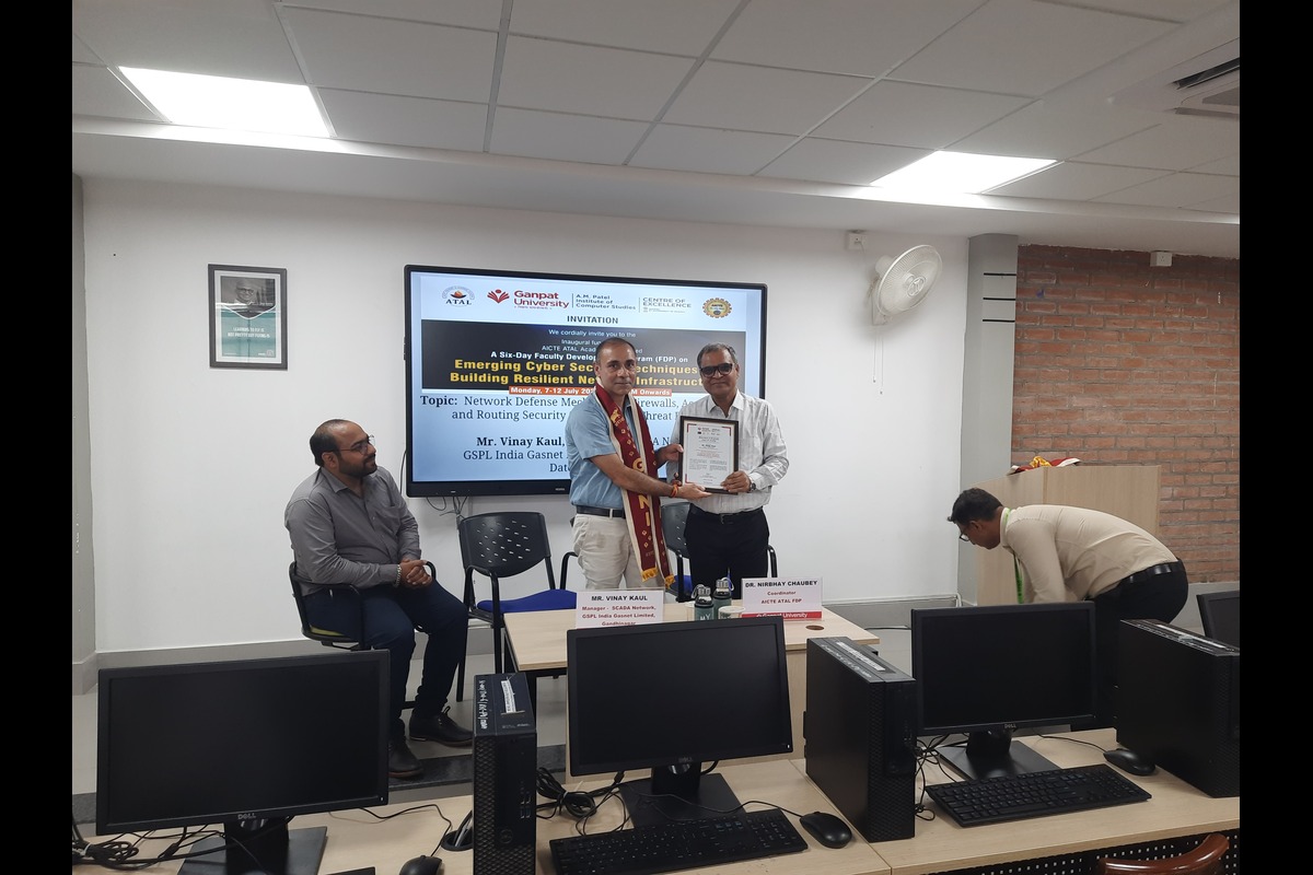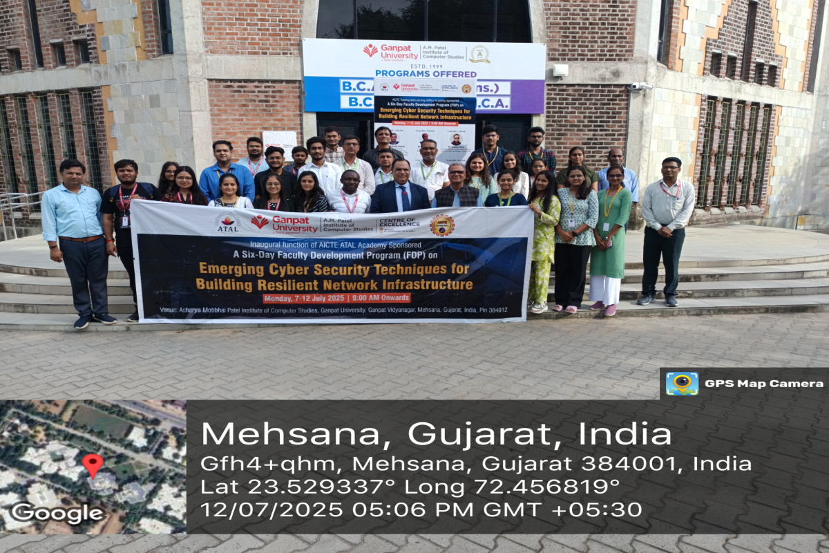 AICTE Training and Learning (ATAL) sponsored Sk Days Faculty Development programme on "Emerging Cyber Security Techniques for Building Resilient Network Infrastructure" hosted by the Ganpat University, Acharya Motibhai Patel Institute of Computer Studies from 7rh July to l2'h July 2O25.