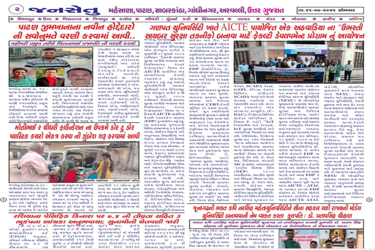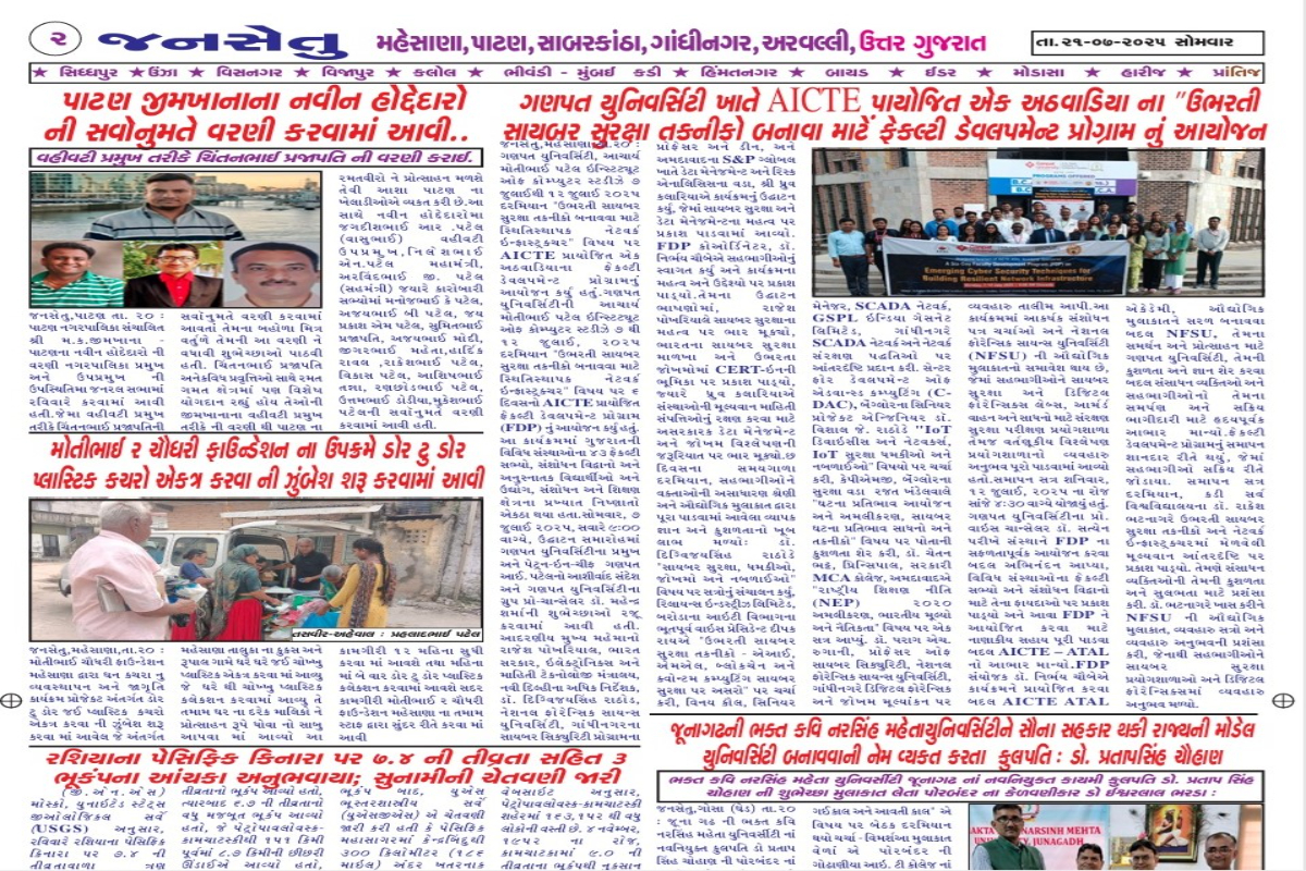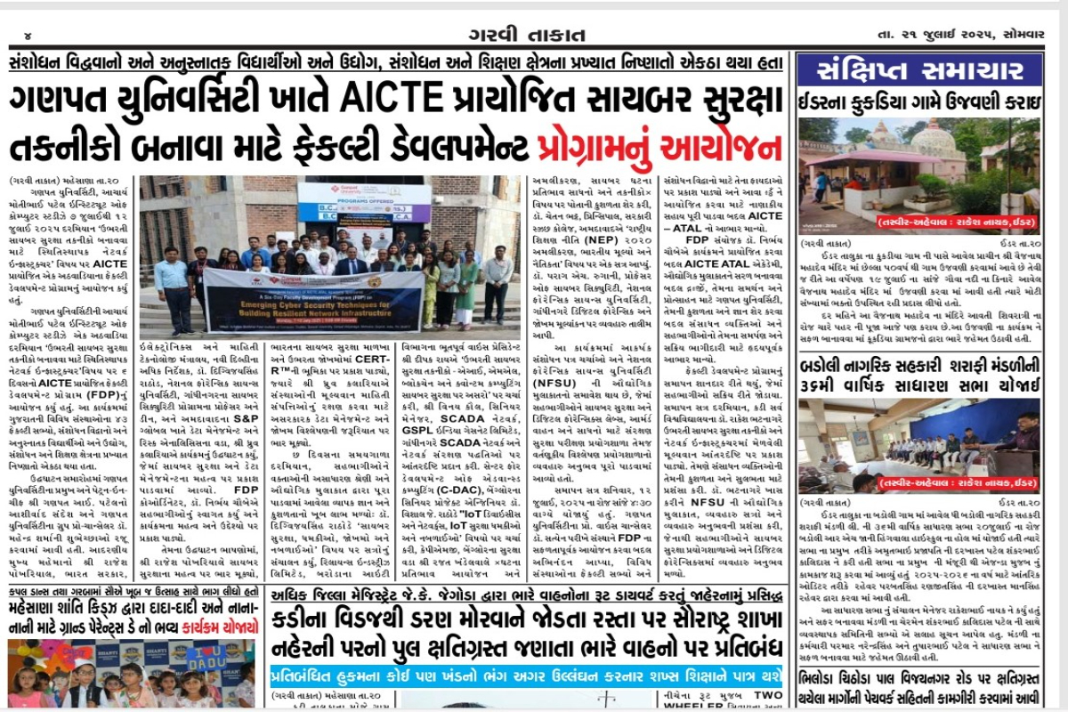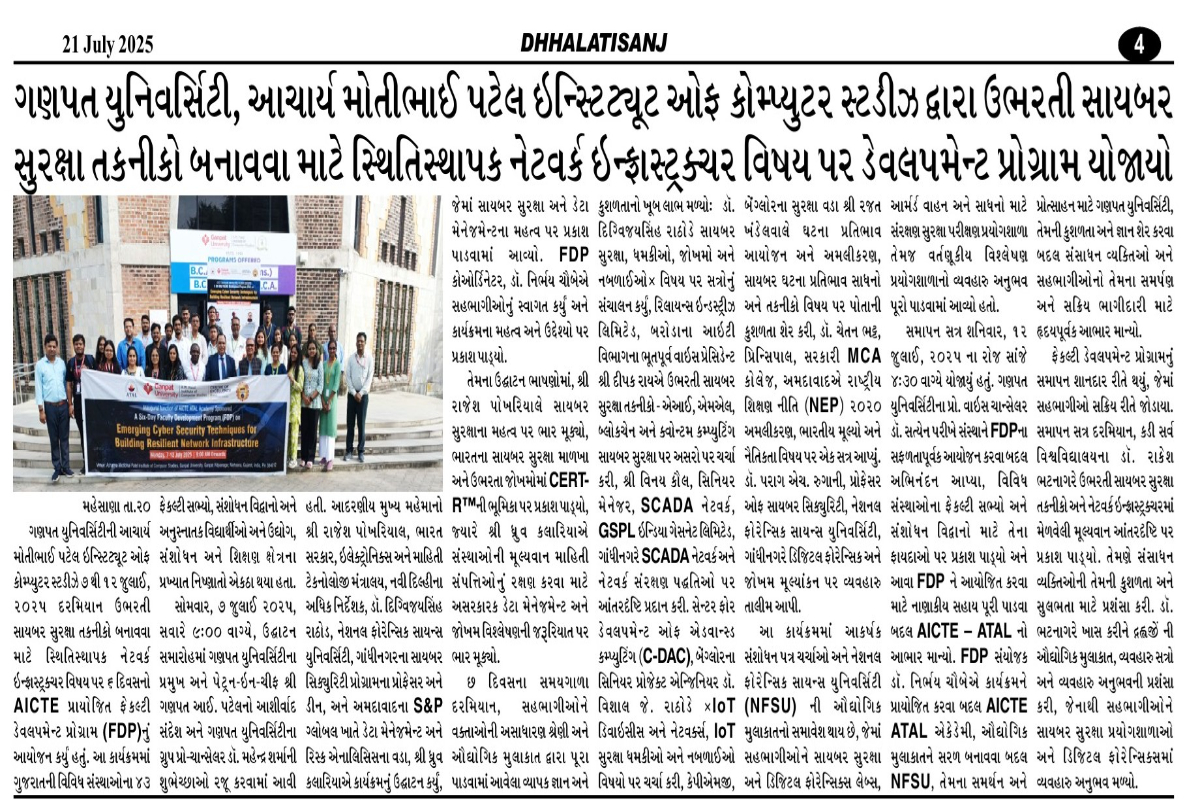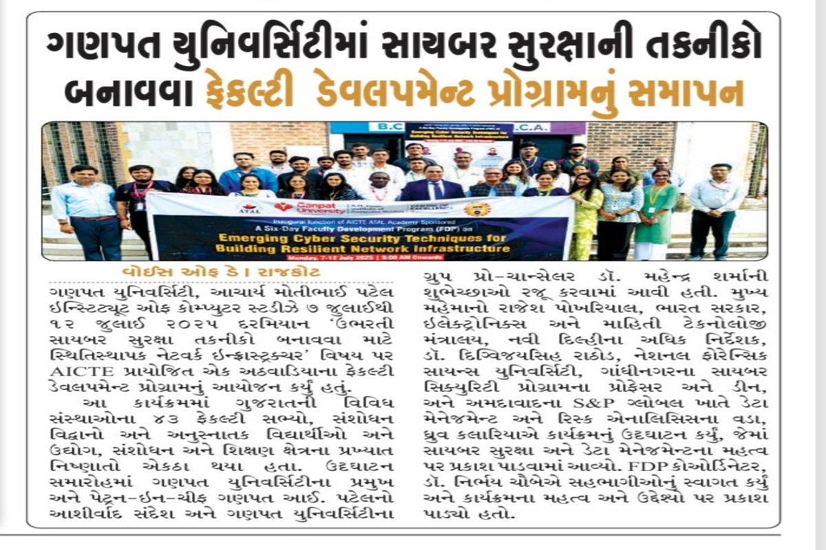 AICTE Training and Learning (ATAL) sponsored Sk Days Faculty Development programme on "Emerging Cyber Security Techniques for Building Resilient Network Infrastructure" hosted by the Ganpat University, Acharya Motibhai Patel Institute of Computer Studies from 7rh July to l2'h July 2O25.