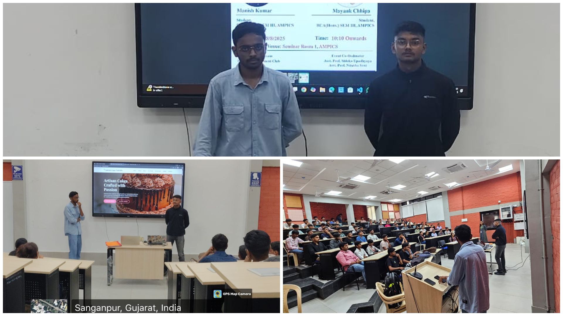 A One Day Workshop titled “Building Blocks of the Web: HTML & CSS Basics” was organized by the Student Development Club of AMPICS, Ganpat University. The workshop was conducted on 28th August 2025 at Seminar Room 1, AMPICS, starting from 10:10 AM onwards. The session focused on introducing students to foundational concepts of web development, emphasizing the structure of web pages using HTML and the application of basic styling through CSS. The event featured two student speakers, Manish Kumar and Mayank Chhipa, both from BCA (Hons.) Semester III, who shared their knowledge and practical understanding of front-end technologies. Their interactive demonstrations and explanations helped participants gain clarity about creating simple web pages. The workshop was coordinated under the guidance of Asst. Prof. Shloka Upadhyaya and Asst. Prof. Nitusha Soni, whose support ensured the smooth and effective execution of the event. Overall, the workshop proved to be an informative and engaging learning experience for the students